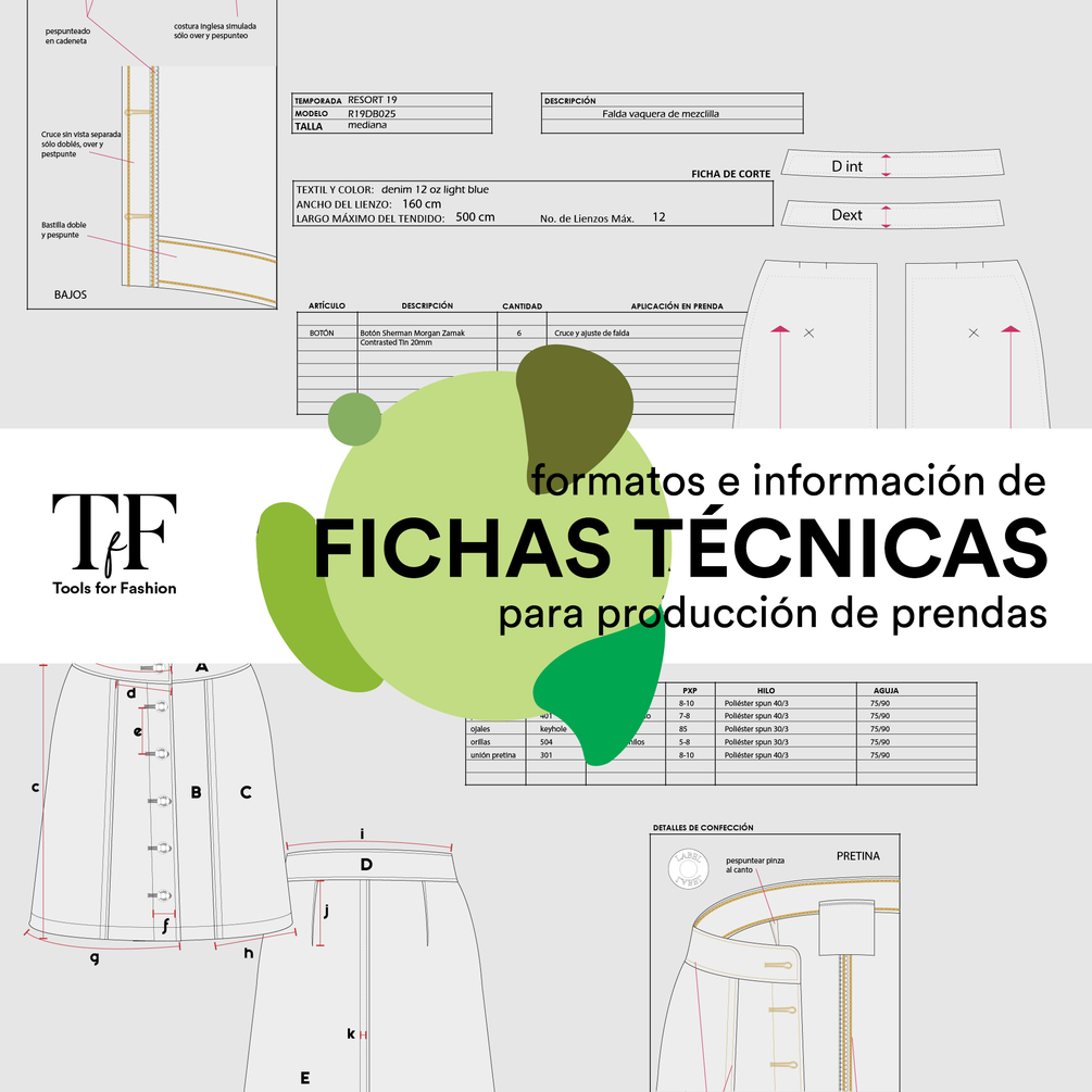 Set of technical sheets for designing and manufacture garments: General, for accesories, for cutting and for sewing.
