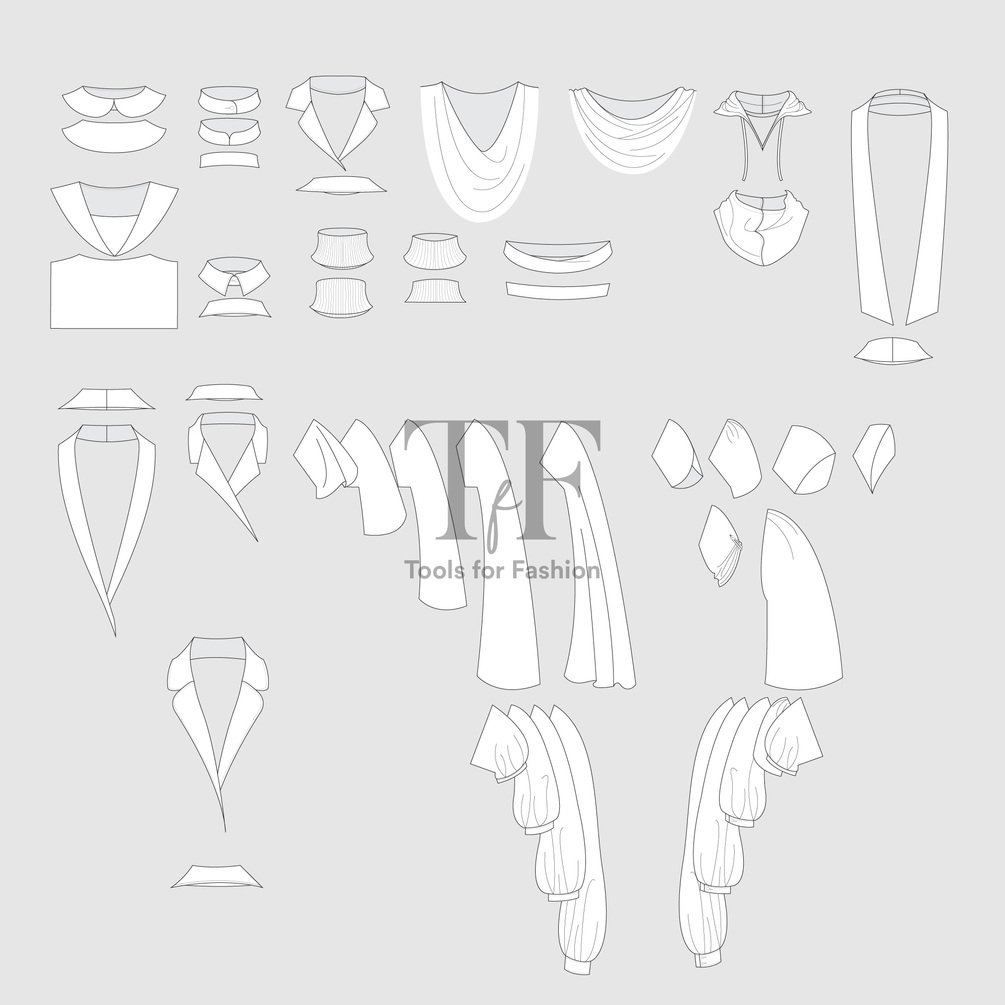 Illustrator editable file with 76 vector objets: collars and sleeves for woman clothing.
